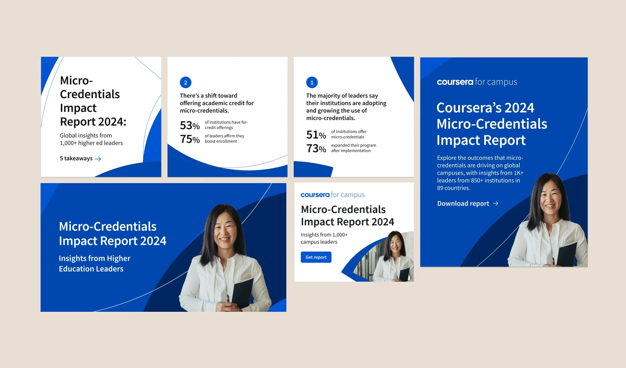 I implemented a design system for a large-scale campaign promoting Coursera’s Micro-credentials report. Deliverables include web assets, social posts, and art direction of a promotional animation video.
