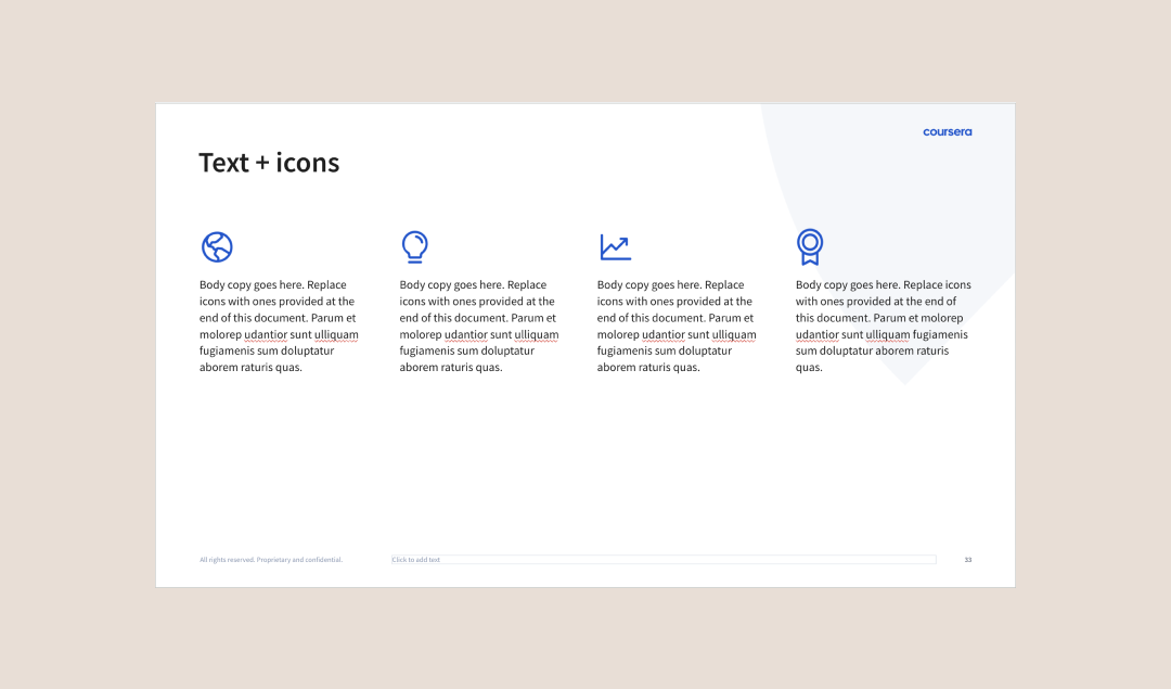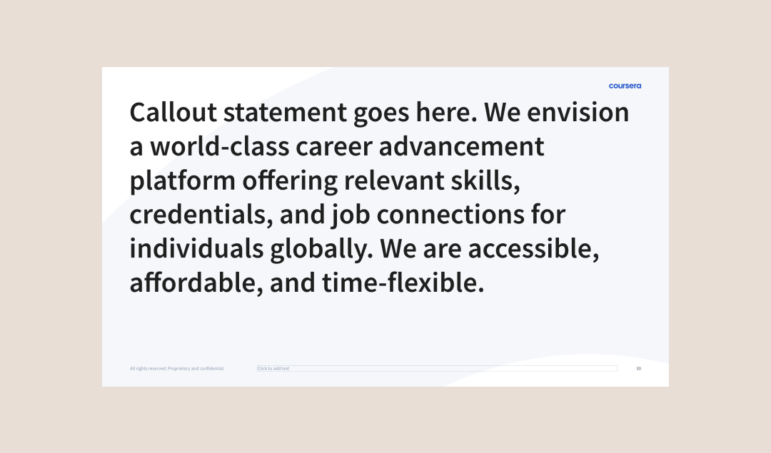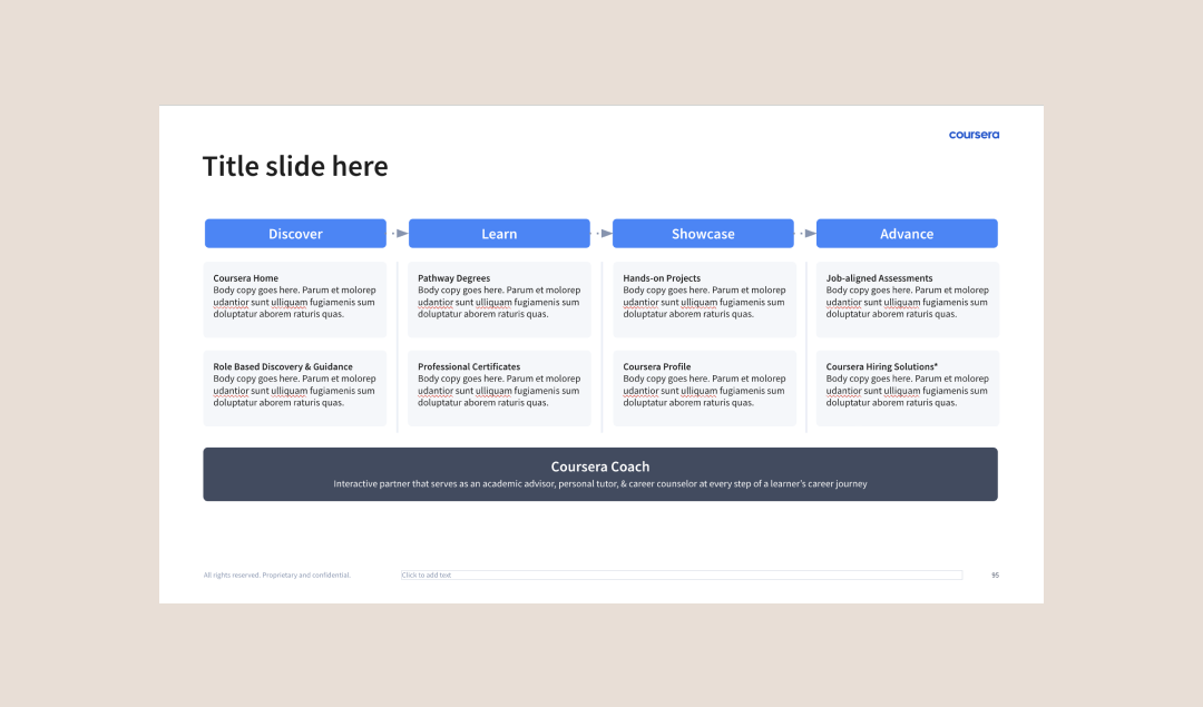 I created a dynamic, efficient, and refreshed template system for all of Coursera’s presentations in Google Slides. I performed a presentation audit and redesigned 120+ use cases. I built the theme, including placeholder type styles and color system, and created the dynamic conduit patterns from the Coursera brand.